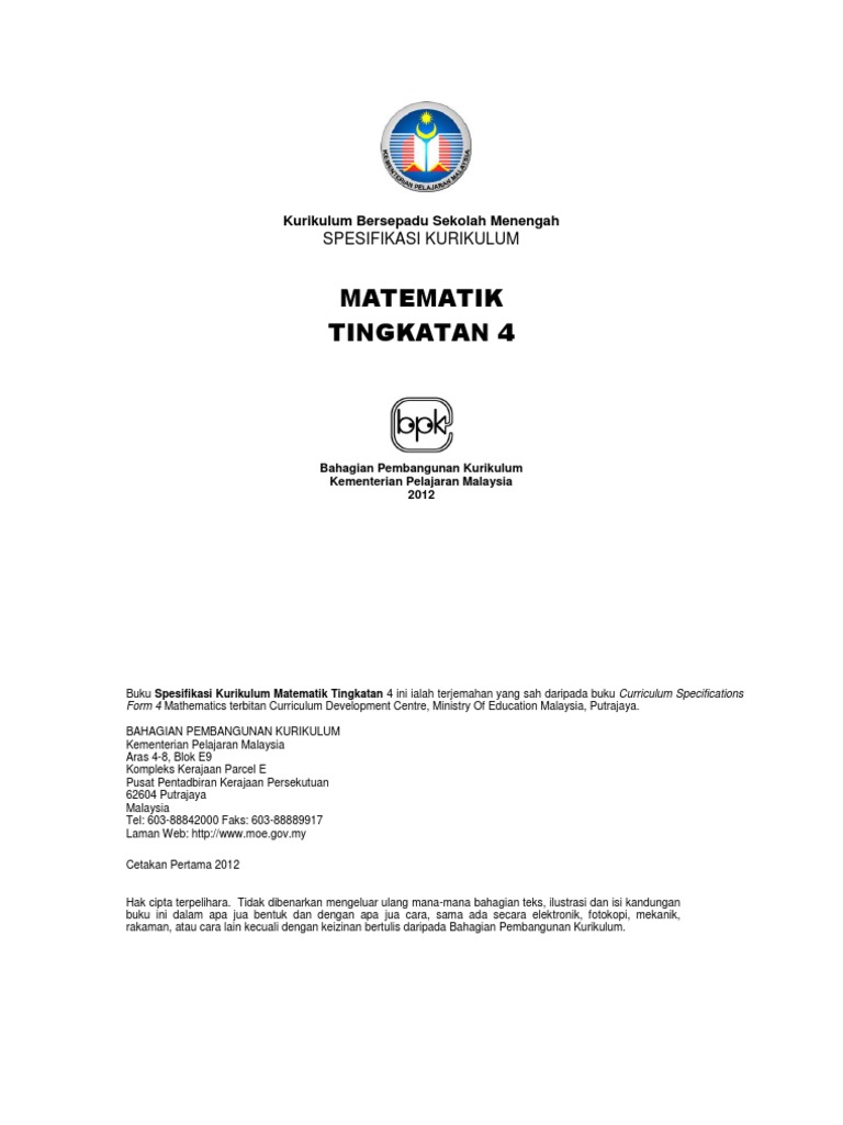 Hsp pendidikan sivik dan kewarganegaraan tingkatan 1. Inggeris sehingga tamat tingkatan 5 berdasarkan kesediaan guru dan murid di sekolah. Buku spesifikasi kurikulum matematik tingkatan 5 ini ialah terjemahan yang sah daripada buku curriculum specifications form 5 mathematics terbitan curriculum development centre, ministry of education malaysia, putrajaya. Kurikulum matematik sekolah malaysia mengekalkan hasratnya untuk memperkembangkan ilmu matematik dan kecekapan serta menyemai sikap positif terhadap matematik dalam kalangan murid. If you continue browsing the site, you agree to the use of cookies on this website.