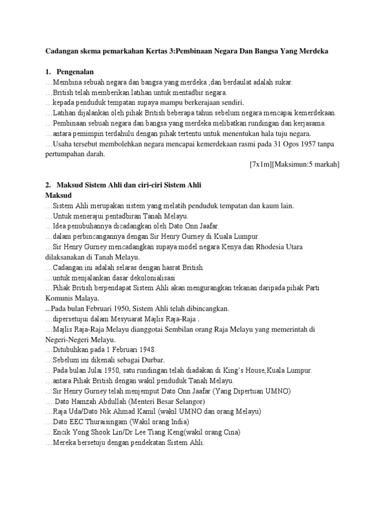 Pembinaan negara dan bangsa yang merdeka tema/tajuk:11.1 pembinaan negara dan bangsa yang merdeka soalan:sistem ahli yang diperkenalkan oleh british di tanah melayu telah men. Menerusi lembaga peperiksaan malaysia (lpm), tema umum sejarah kertas 3 spm 2018 adalah 'pembinaan negara dan bangsa ke arah kemunculan negara malaysia berdaulat'. Tema tahun 2017 adalah kemunculan dan perkembangan nasionalisme sehingga perang dunia kedua manakala tema umum tahun 2016 adalah malaysia dan kerjasama masyarakat antarabangsa. Sejarah kertas 3 skema jawapan pembinaan negara dan bangsa malaysia panduan buat pelajar sijil pelajaran malaysia spm. Pembinaan negara dan bangsa yang merdeka kertas 3 jawapan.